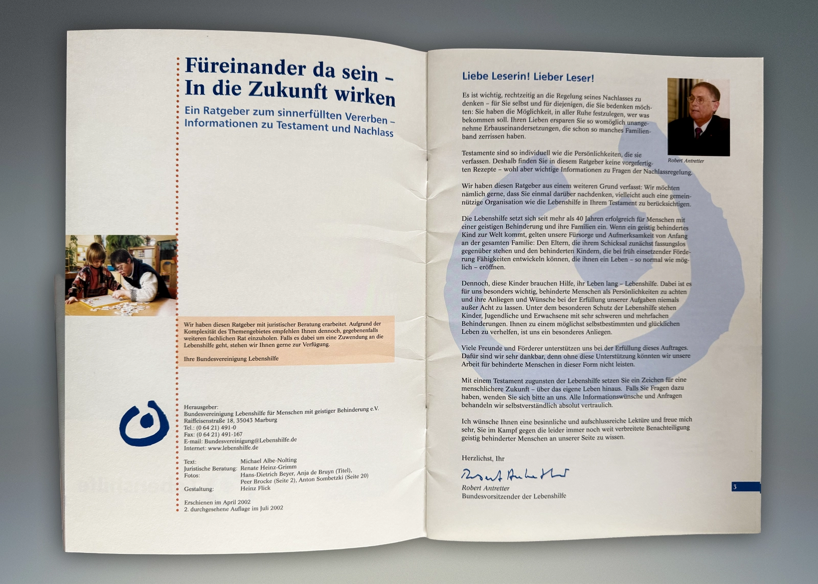- 3–5) 2002: Erbschaftsbroschüre der Lebenshilfe: 3) Titelseite, 4) Einstiegsseiten, 5) Typische Innen-Doppelseite