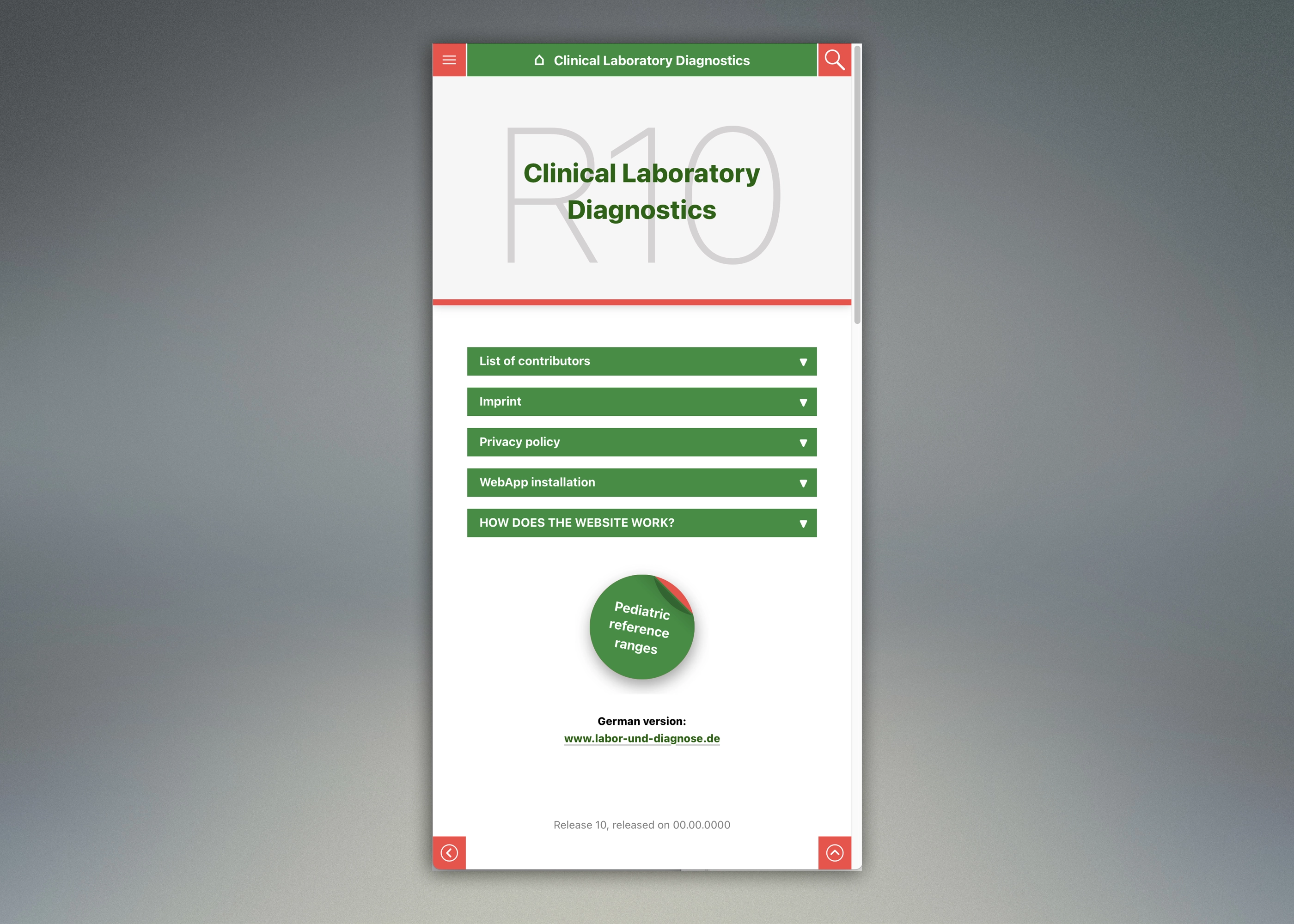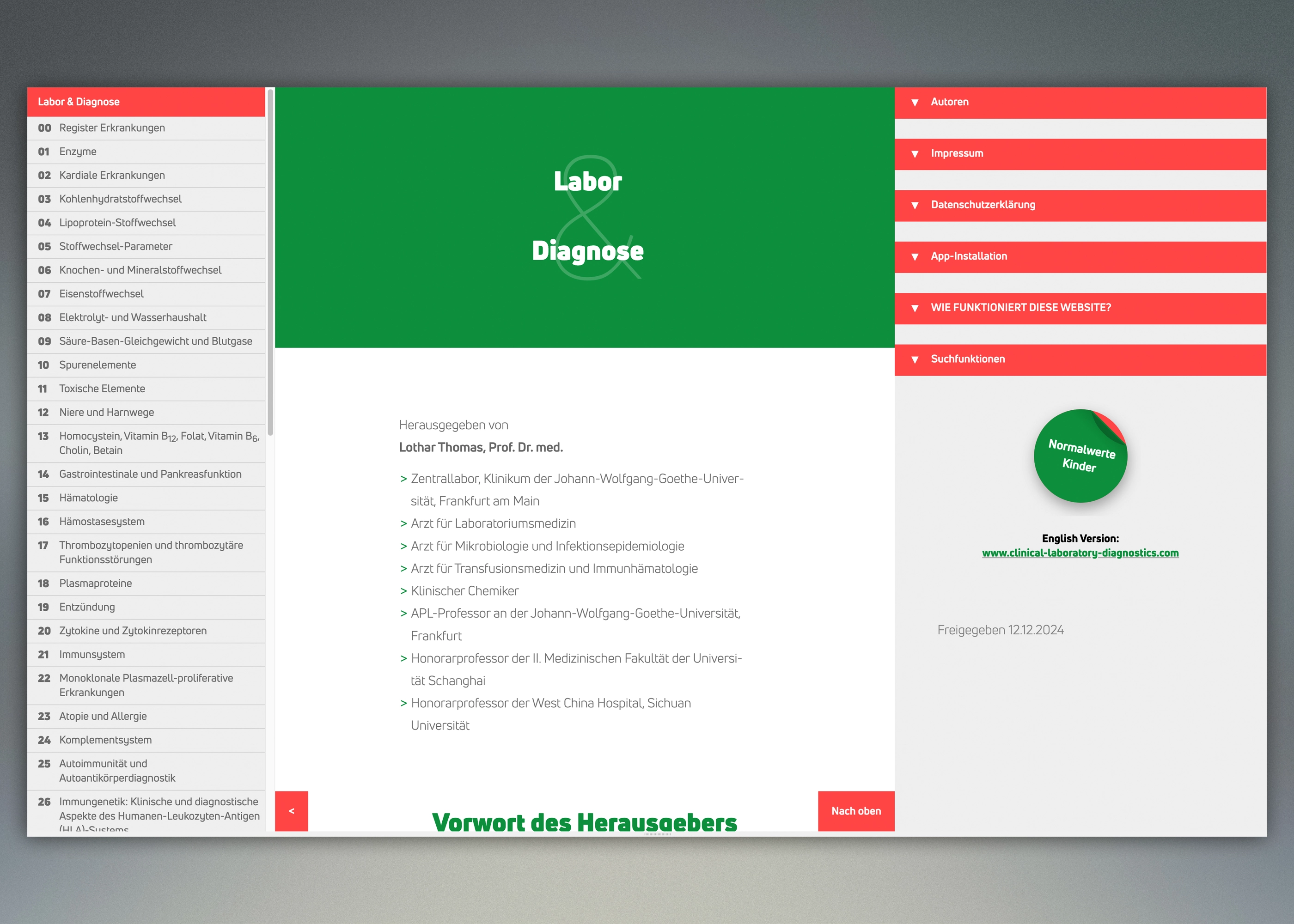 - 2019 wurde festgestellt, dass die App-Daten aus Performance-Gründen so zerstückelt waren, dass Aktualisierungen und Ergänzungen nicht mehr eingebracht werden konnten. Daraus und aus dem Wegfall des Sponsors entstand bei Herrn Professor Thomas, dem Autor, die Idee, daraus eine frei verfügbare Website zu erstellen. Im Jahr 2020 war ich mit der Aufbereitung der - aus Performance-Gründen - reinen HTML/CSS-Webseiten mit Web-App-Funktionalität in Deutsch und in Englisch fertig und es wurden - basierend auf aktualisierten und erweiterten InDesign-Daten, in denen auch alle externen Links ergänzt wurden - die Sites www.labor-und-diagnose-2020.de und www.clinical-laboratory-diagnostics-2020.com veröffentlicht. Diese beiden Websites wurden regelmäßig aktualisiert: 2021: Release 1, 2021: Release 2, 2022: Release 3. Ab 2022 haben wir dann auf das „-2020“ verzichtet und die beiden Sites wurden als labor-und-diagnose.de und clinical-laboratory-diagnostics.com weiterhin ständig aktualisiert: 2022: Release 4, 2023: Release 5, 2023: Release 6, 2024: Release 7, 2024: Release 8, 2024: Release 9. Mit dem 2025 erschienenen Release 10 führten wir einen Relaunch durch, der eine modernere Optik, eine verbesserte Suchfunktion sowie Performance-Optimierungen brachte. Aktuell ist derzeit Release 11 online.