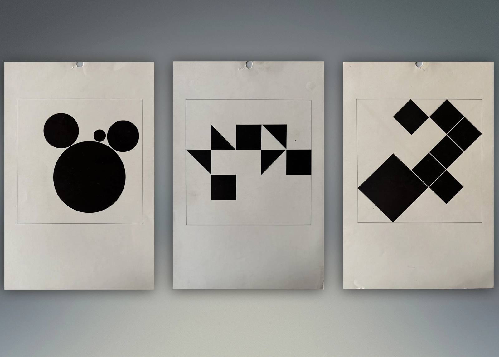 - 4 + 5) Reinzeichnungs-Übungen (was heute in Minuten in Adobe Illustrator oder InDesign machbar ist, war damals zeitintensiv: am Zeichenbrett mit Tusche-Rapidographen für die Konturen und Füllung der Konturen mit Tusche per Pinsel)