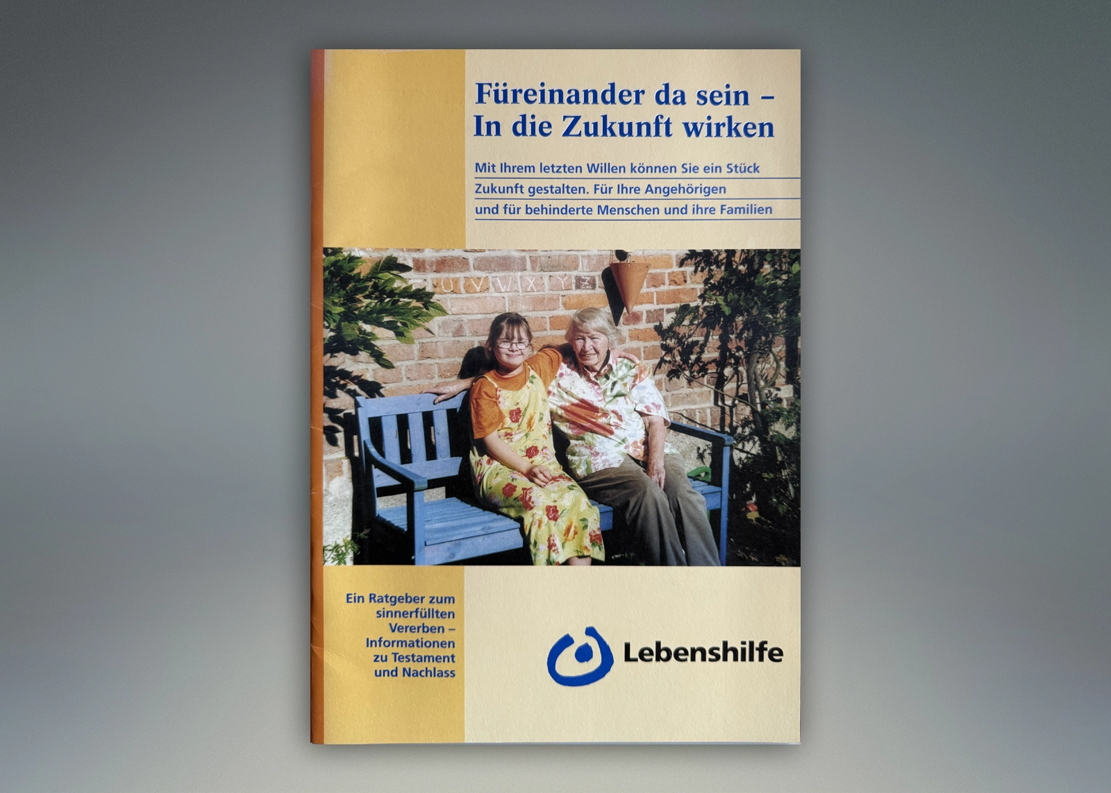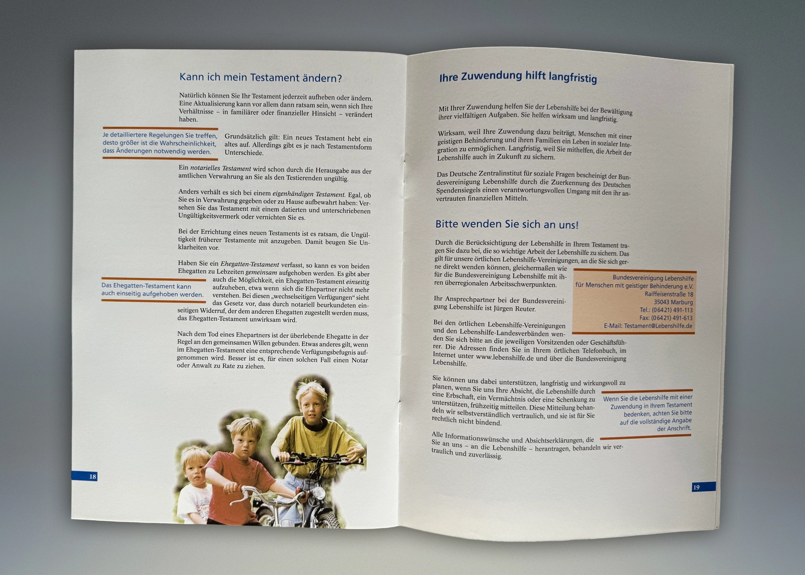- 3–5) 2002: Erbschaftsbroschüre der Lebenshilfe: 3) Titelseite, 4) Einstiegsseiten, 5) Typische Innen-Doppelseite