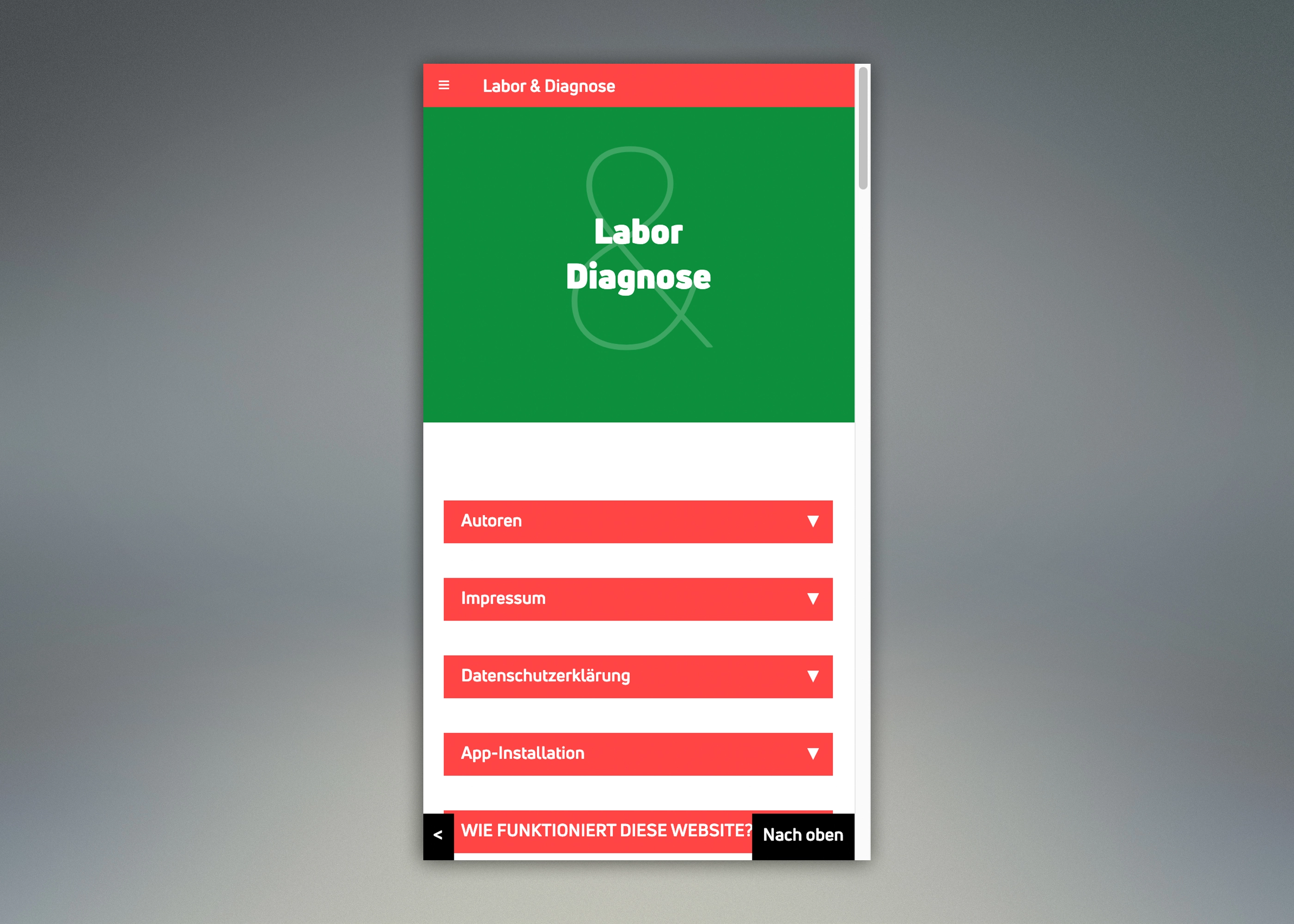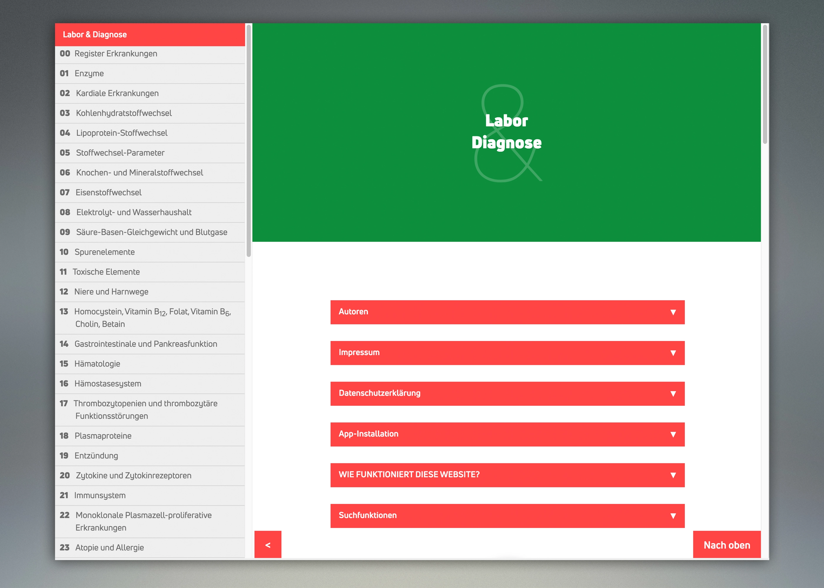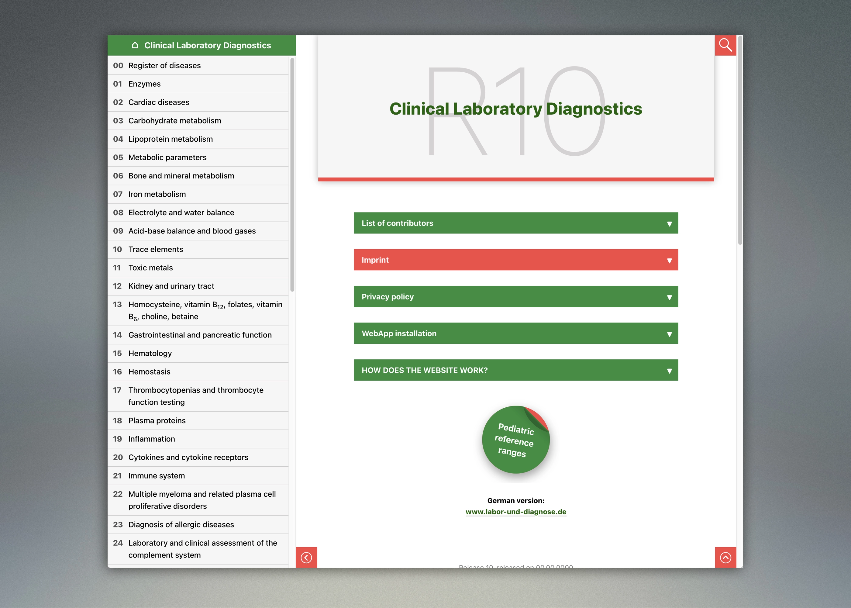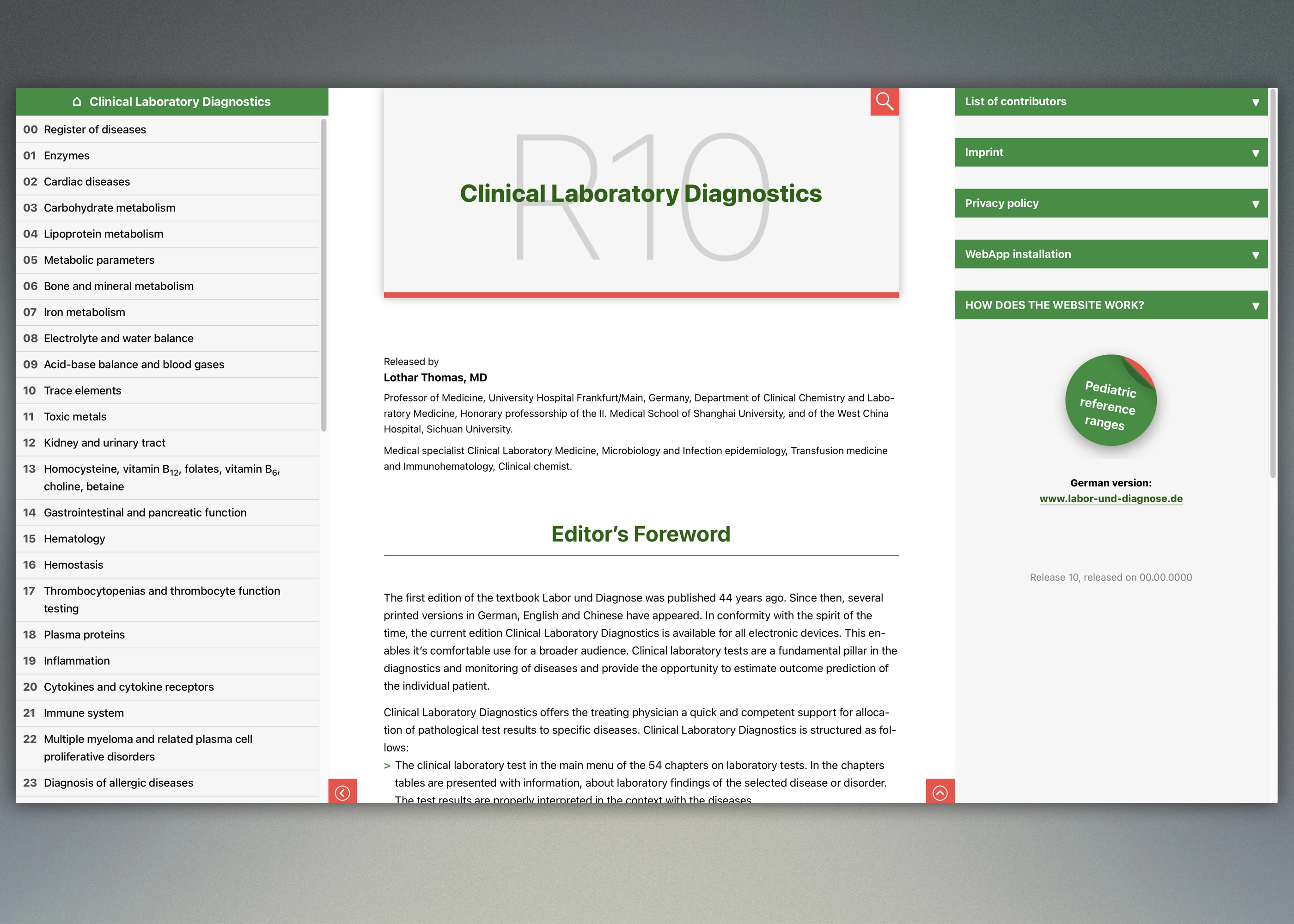 - 2019 wurde festgestellt, dass die App-Daten aus Performance-Gründen so zerstückelt waren, dass Aktualisierungen und Ergänzungen nicht mehr eingebracht werden konnten. Daraus und aus dem Wegfall des Sponsors entstand bei Herrn Professor Thomas, dem Autor, die Idee, daraus eine frei verfügbare Website zu erstellen. Im Jahr 2020 war ich mit der Aufbereitung der - aus Performance-Gründen - reinen HTML/CSS-Webseiten mit Web-App-Funktionalität in Deutsch und in Englisch fertig und es wurden - basierend auf aktualisierten und erweiterten InDesign-Daten, in denen auch alle externen Links ergänzt wurden - die Sites www.labor-und-diagnose-2020.de und www.clinical-laboratory-diagnostics-2020.com veröffentlicht. Diese beiden Websites wurden regelmäßig aktualisiert: 2021: Release 1, 2021: Release 2, 2022: Release 3. Ab 2022 haben wir dann auf das „-2020“ verzichtet und die beiden Sites wurden als labor-und-diagnose.de und clinical-laboratory-diagnostics.com weiterhin ständig aktualisiert: 2022: Release 4, 2023: Release 5, 2023: Release 6, 2024: Release 7, 2024: Release 8, 2024: Release 9. Mit dem 2025 erschienenen Release 10 führten wir einen Relaunch durch, der eine modernere Optik, eine verbesserte Suchfunktion sowie Performance-Optimierungen brachte. Aktuell ist derzeit Release 11.