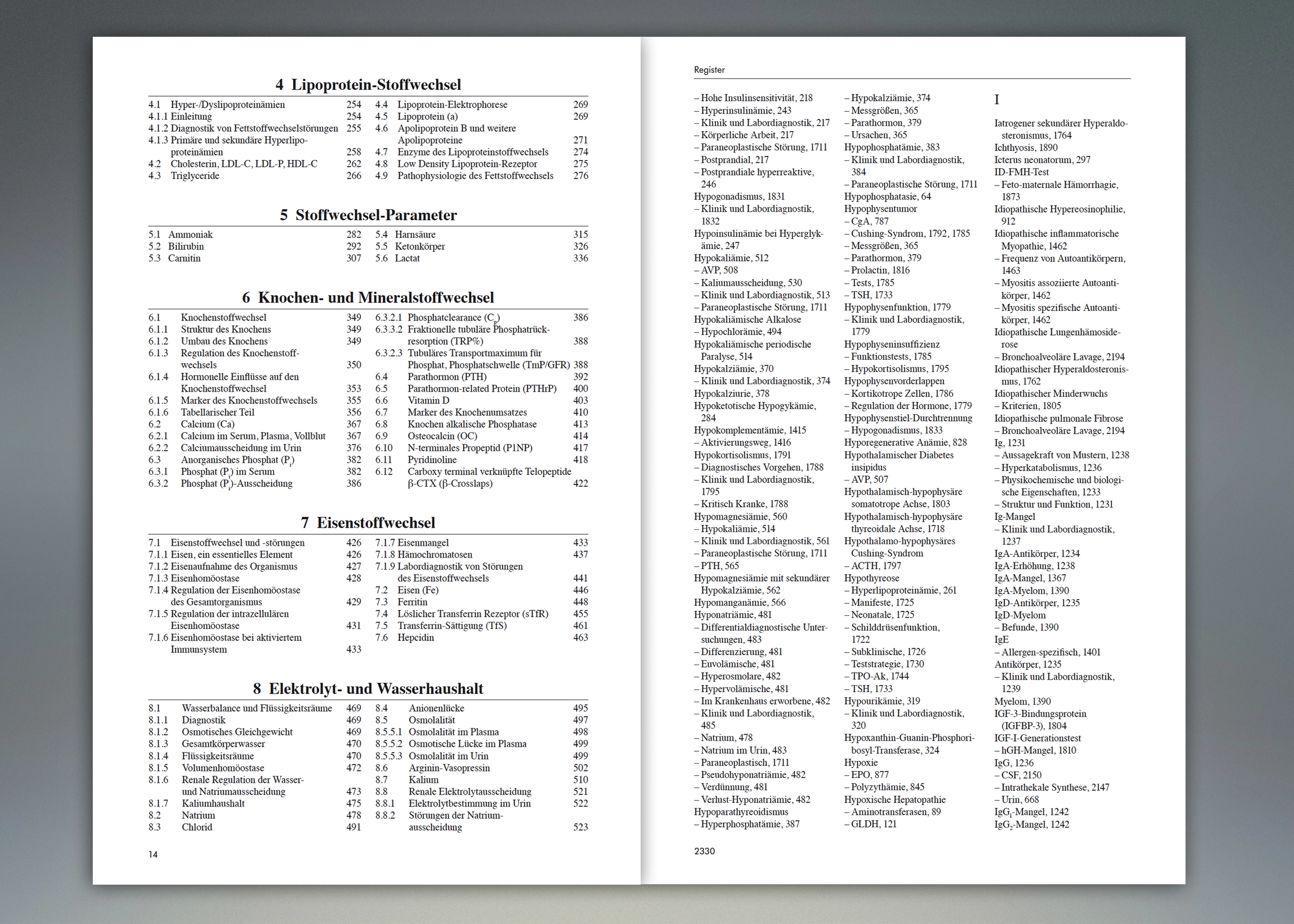 - 9–11) Letzte Auflage (8.) des Buchs „Labor & Diagnose“ (2012 – 2.360 Seiten in 2 Bänden): 7) Außenansicht der beiden Bände, 8) Typische Seiten Inhaltsverzeichnis und Register, 9) Typische Inhalts-Doppelseite