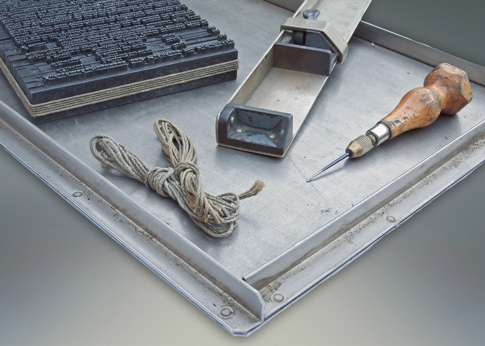 - 3) Setzform, Ahle, Winkelhaken, Schnur und gebundener Satz