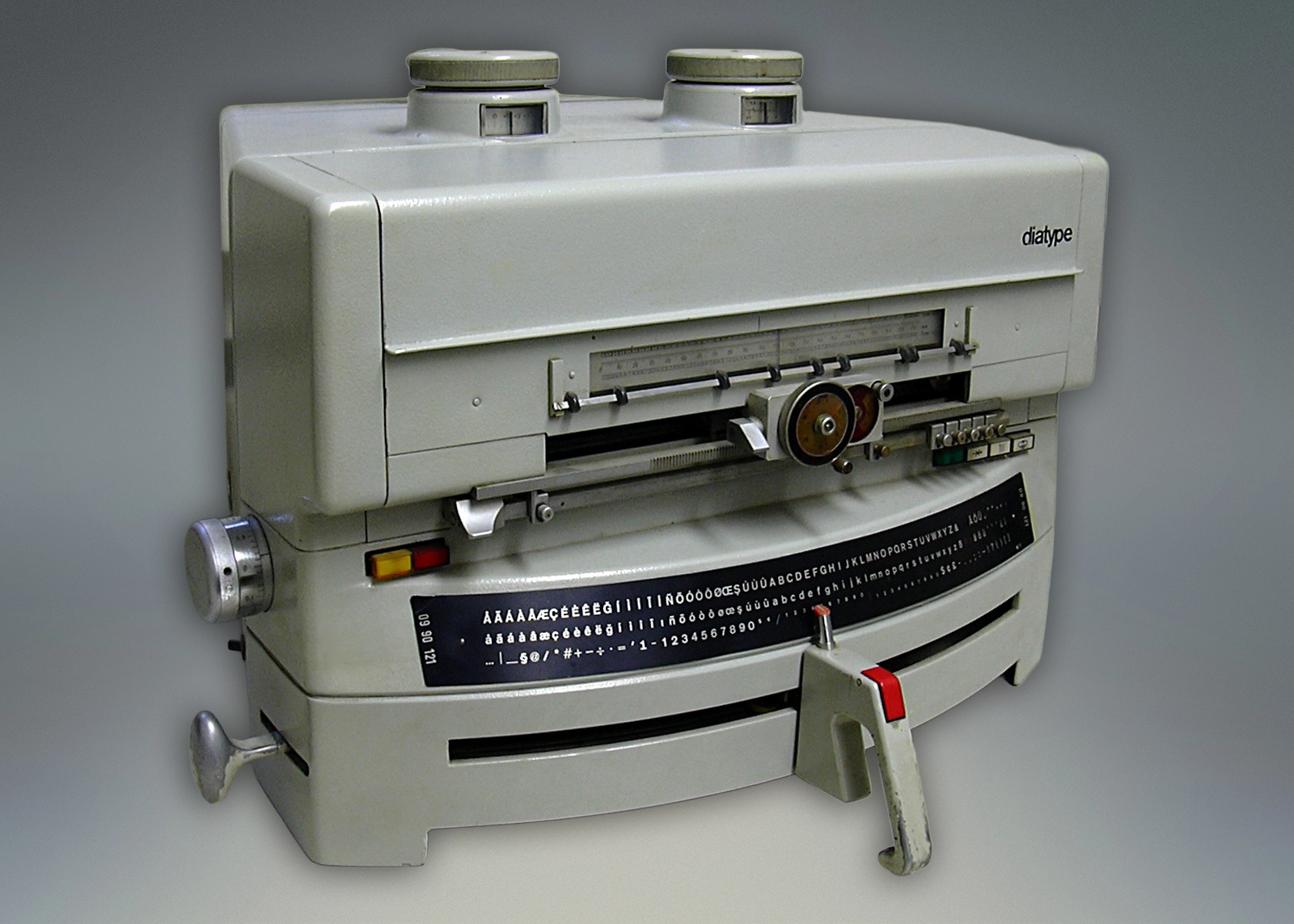 - 2) Diatype (erstes echtes Fotosatzgerät, mit dem - mit enormem Zeitaufwand - auch komplexe Tabellenseiten möglich waren), siehe auch Wikipedia